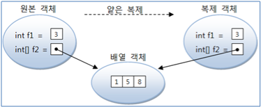 얕은 복제(thin clone): 필드 값만 복제 (참조 타입 필드는 번지 공유)